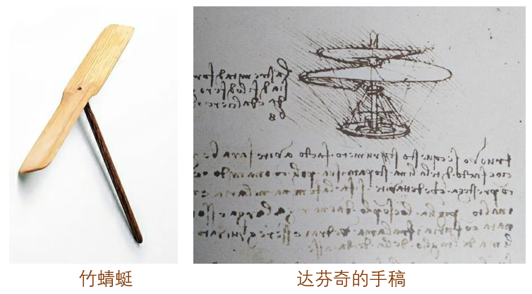 正如前言部分所说的,人类最早的旋翼设计理念源自竹蜻蜓,而人类首个旋翼飞行的设计手稿则来自于有着“穿越者”美称的达芬奇。