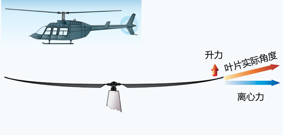 当然,旋翼运动的复杂程度远不止于此,在实际工作中,旋翼的挥舞和摆振还有相互的影响。直升机起飞后,在旋翼升力和离心力的共同作用下,旋翼叶片会向上翘曲,叶片的重心位置会随之变化。向上翘的越多,叶片越向中央“收拢”,其重心也更靠近主轴。根据角动量守恒,叶片向中央“收拢”时,其角速度会增大。当叶片上下挥舞时,其重心的聚散变化会引起角速度的变化,从而影响到摆振的幅度。具体而言,向上挥舞时,叶片的角速度增大,叶片更趋向于向前摆振,向下挥舞时则相反。