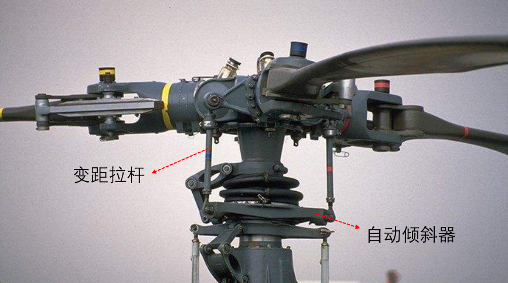 熟悉直升机桨毂结构的小伙伴们都知道,除了挥舞铰和摆振铰,还有一个更重要的结构,便是自动倾斜器,或称斜盘。斜盘的上下运动可带动变距拉杆,使得桨距发生变化,从而调节旋翼拉力。如果使斜盘向一侧倾斜,则可使每一片叶片的桨距产生周期性变化,从而调节旋翼整体的拉力方向。因此,通过合理的操纵斜盘,便可获取任意方向的旋翼拉力,实现对飞行姿态的灵活控制。