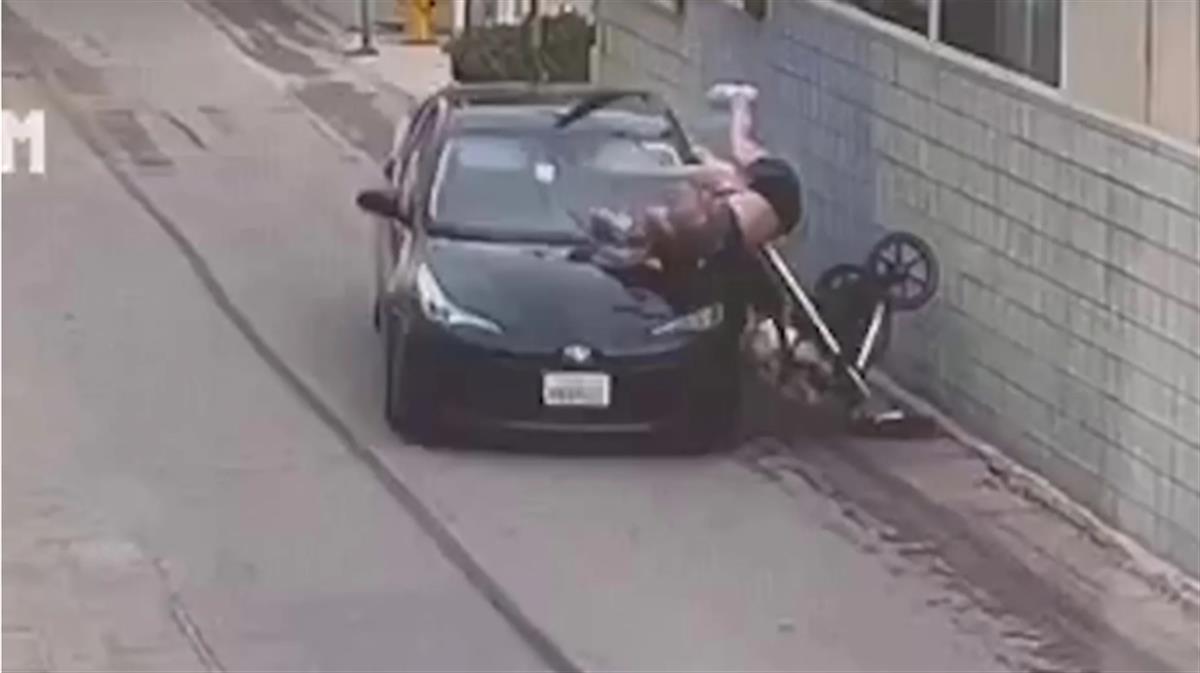 视频监控捕捉到了他撞人一幕,事发时,一位妇女正推着婴儿车经过,妇女被撞上了引擎盖,婴儿车被撞翻。