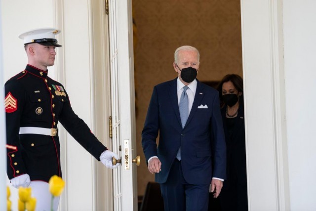 4月11日,美国总统拜登(左二)准备在华盛顿白宫发表讲话。新华社记者刘杰摄