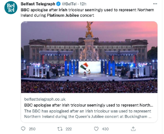 据英国北爱尔兰《贝尔法斯特电讯报》5日报道,在本周末举行的英国女王伊丽莎白二世登基70周年的庆典上,英国广播公司(BBC)出现了严重的播出事故,竟用爱尔兰共和国的三色国旗代表了英国的北爱尔兰地区。