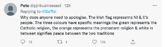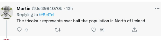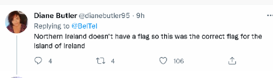 如下图所示,有的网民就表示,用爱尔兰的旗帜代表爱尔兰没错呀。有的人还补充说,北爱尔兰可是有一半人认爱尔兰的三色旗的。还有的人表示,北爱尔兰六郡的旗帜最终都会变成三色旗,BBC不过是承认了这个事实,预见了那个未来。