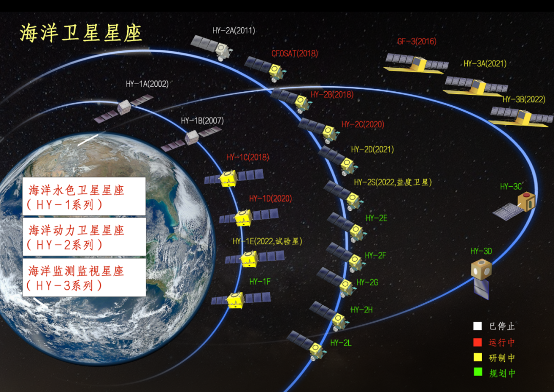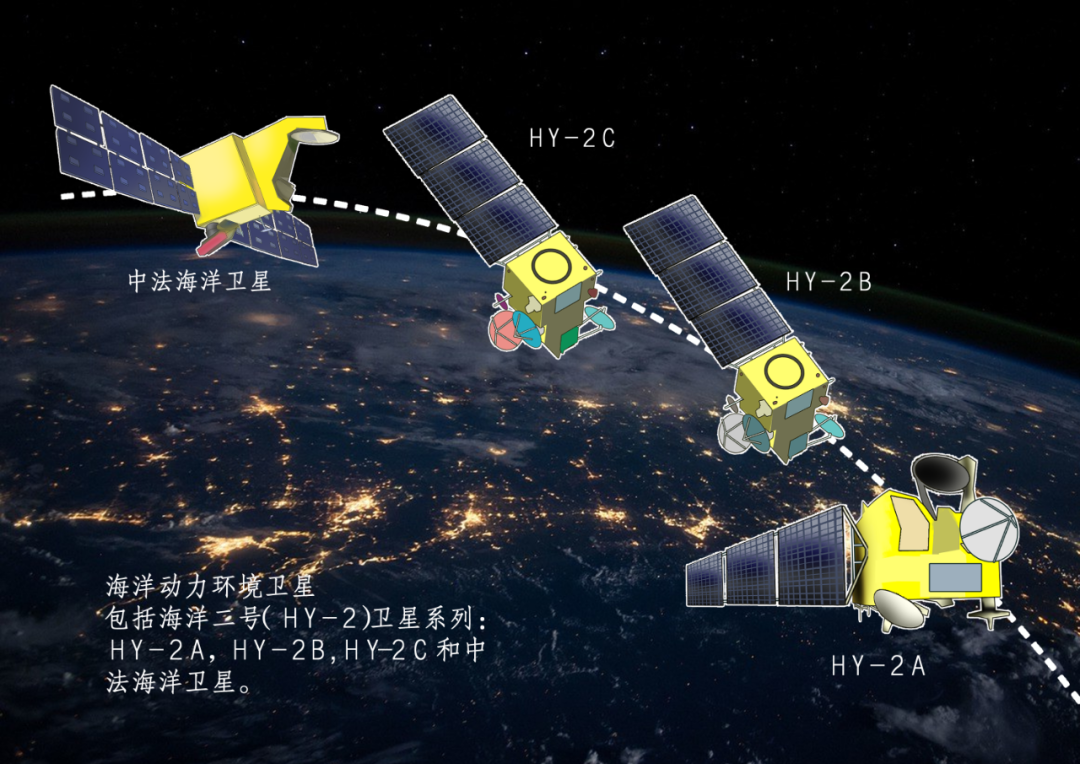 HY-2B、HY-2C和HY-2D形成1颗极轨两颗倾斜轨道组网运行,组成了我国首个海洋动力环境卫星星座,共同构成我国海洋动力环境监测网。