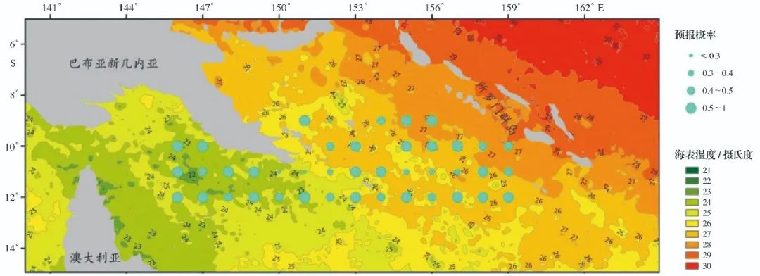 △图注:利用HY-1C、HY-2B、EOS/MODIS等卫星数据制作的巴布亚新几内亚金枪鱼概率图
