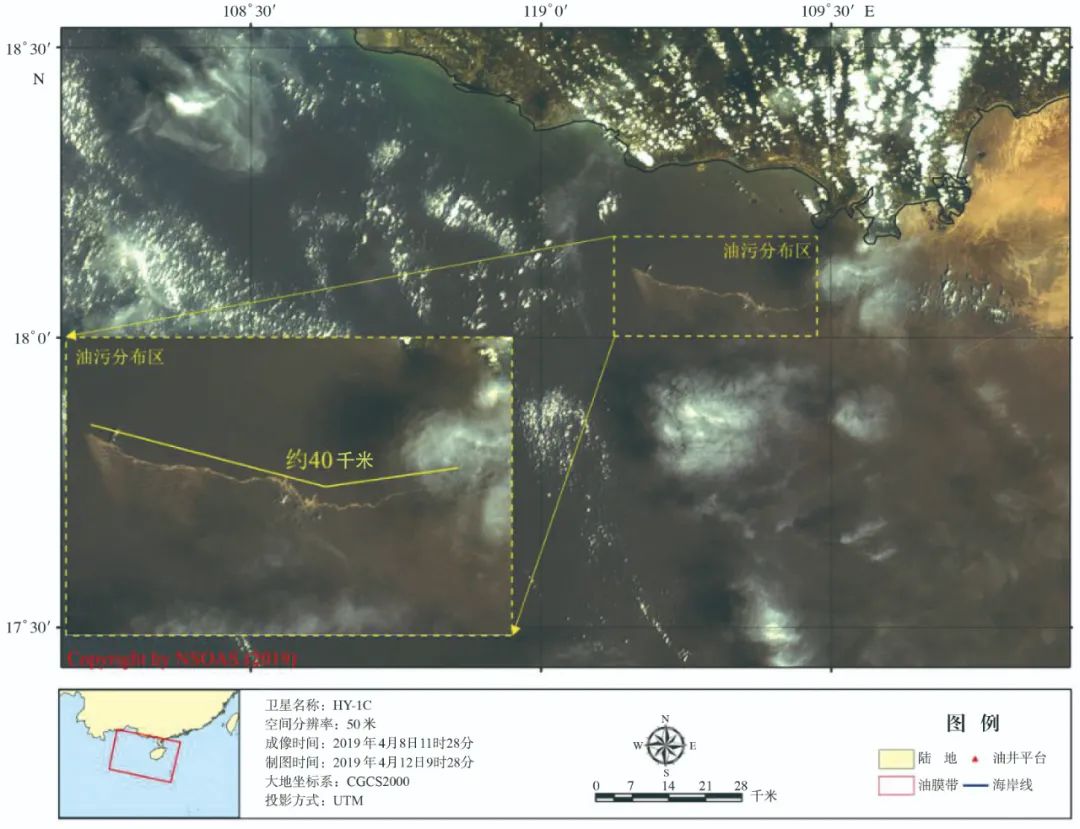 △图注:HY-1C卫星数据三亚溢油应急遥感检测图(对三亚附近船舶溢油的持续遥感监测,为海上溢油事件快速响应、应急处理和海洋生态环境保护与修复提供了辅助决策支持)