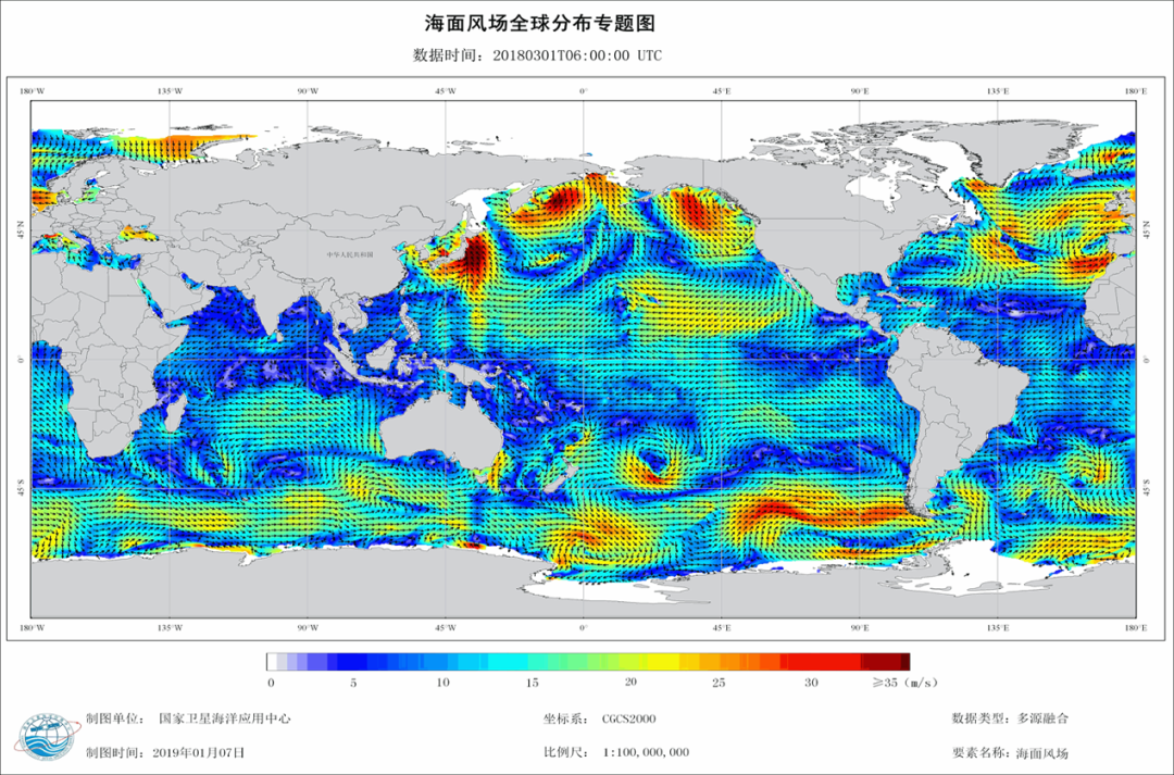 △图注:HY-2B搭载的微波辐射观测到的2018年3月1日全球海面风场分布(数据来源:国家卫星海洋应用中心发布的HY-2B数据,图中可以看到日本东部及太平洋北部有台风形成)