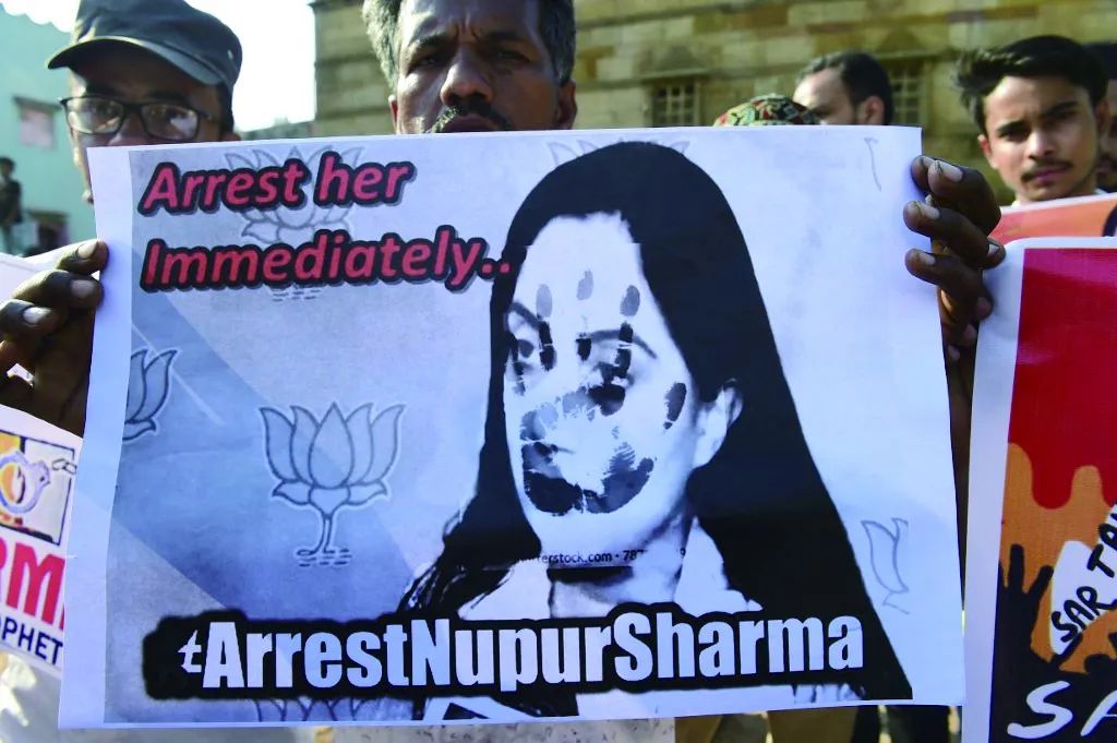 8日,在印度城市艾哈迈达巴德,抗议者手举标语,要求逮捕印度人民党前发言人夏尔玛。