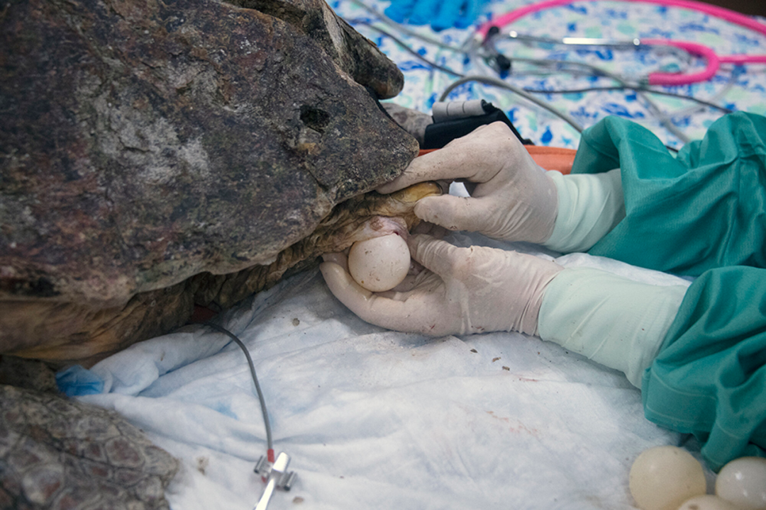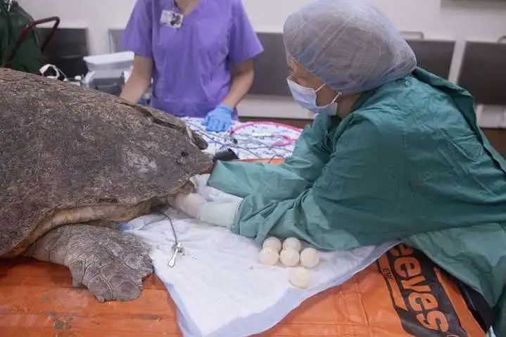 治疗之前,兽医们必须先帮大白生孩子。他们准备了鱿鱼和螃蟹作为食物,设置了一个装满沙子的生产场所,又用钙和催产素来刺激分娩。大白产下了100多个蛋,它们送往一个海龟保护项目,接下来将在人造巢穴中孵化。