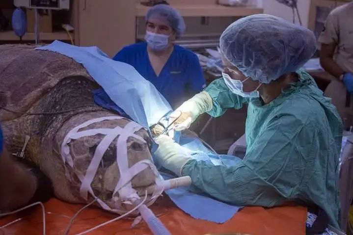 生完了孩子,大白就可以接受正式的治疗了。在长达7个小时的手术中,它露在外面的骨头被移除,伤口也得到了清洁和治疗。在之后的几周时间里,兽医们将密切监视它的恢复情况,它重获健康后就可以重返野外了。巧的是,大白入住的医院最近刚被允许治疗受伤或生病的海龟,大白是他们救治的第一只海龟。