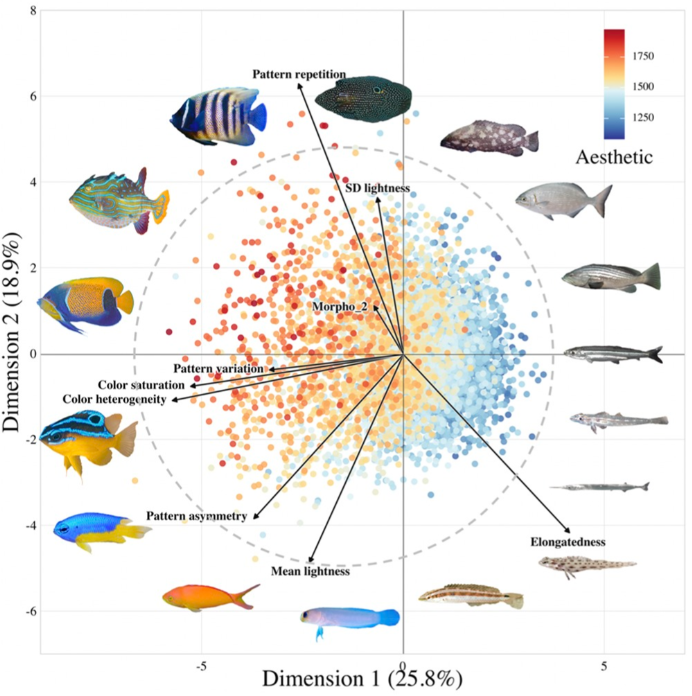 图上左侧的红点越多,代表美丽得分越高,右边蓝点越多则代表评分越低。这项研究的方法也很好玩:先让约13000名参与者对481张珊瑚鱼的照片打分;再根据评分结果,用AI为其他4400张照片生成了评分预测 | 参考文献[2]