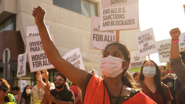 在美洲峰会开幕前,位于洛杉矶的会场外一名抗议者举起标语:“不要在抢来的土地上开虚伪又霸道的会议。”