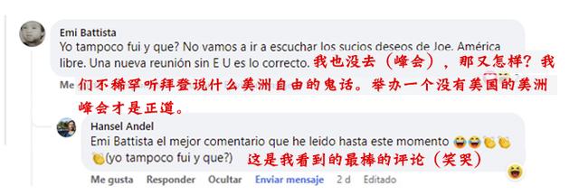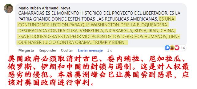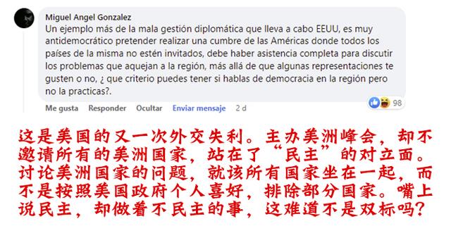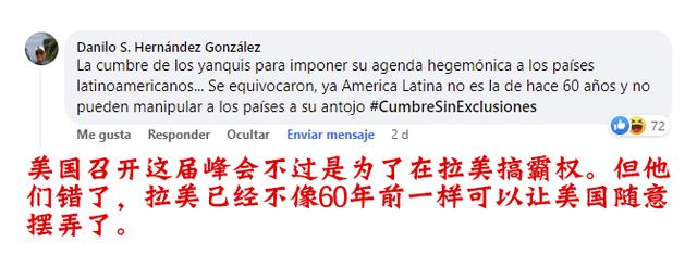 拉美网友纷纷在海外社交媒体上留言“补刀”。他们给美国政府贴上了“独裁”“假民主”“侵犯人权”等标签,认为此次洛杉矶峰会得不到大家的“祝福”,实乃美国自食恶果、自作自受。