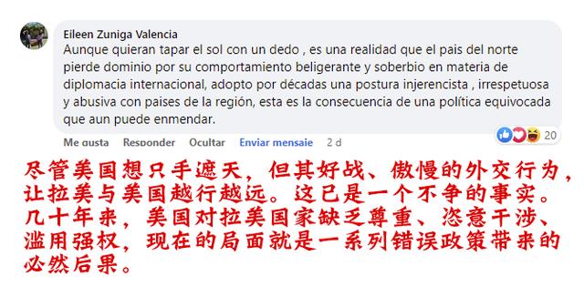 在众多拉美网友看来,美国一方面把拉美视为自己的“后院”,肆意掠夺大量资源和财富,一方面又肆无忌惮地将自己的意愿强加给拉美国家,既虚伪又霸道。而在美国利益面前,那些被成天挂在嘴边的“民主”“自由”等价值观,根本不值一提,弃之如敝屣。