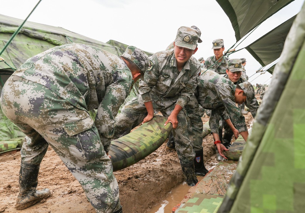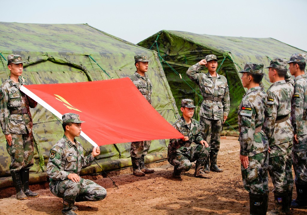 “全员注意,17时左右将有强降雨,大家抓紧设营!”面对即将来临的暴风雨,设营任务变得更加困难。急难险重任务面前,党员先锋队成为野外驻训场上最亮丽的风景,在他们的带领下,官兵们干劲十足,迅速完成设营工作。