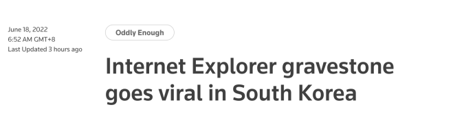 美国微软公司旗下IE浏览器6月15日终止服务。据路透社17日报道,为纪念IE浏览器“退役”,韩国一名软件工程师为其竖了一块墓碑,并加上一段特别碑文,图片迅速在网上疯传。