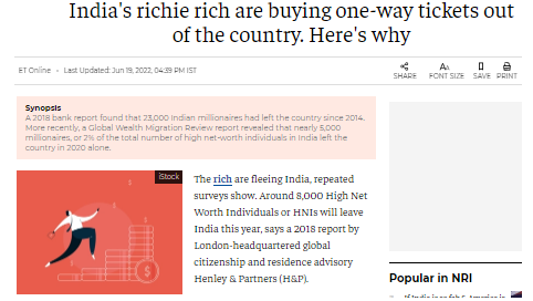 据印度《经济时报》6月19日报道,多项调查显示,印度的富人正在逃离自己的国家。总部位于伦敦的投资移民咨询公司“亨利及合伙人”(Henley Partners)近日公布的一份报告估计,今年将有大约8000名百万富翁,即所谓“高净值人士”(HNWI)离开印度。