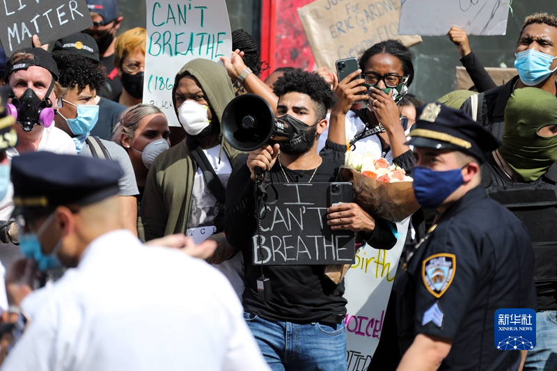 2020年5月29日,在美国纽约,抗议者与警察对峙。新华社记者 王迎 摄