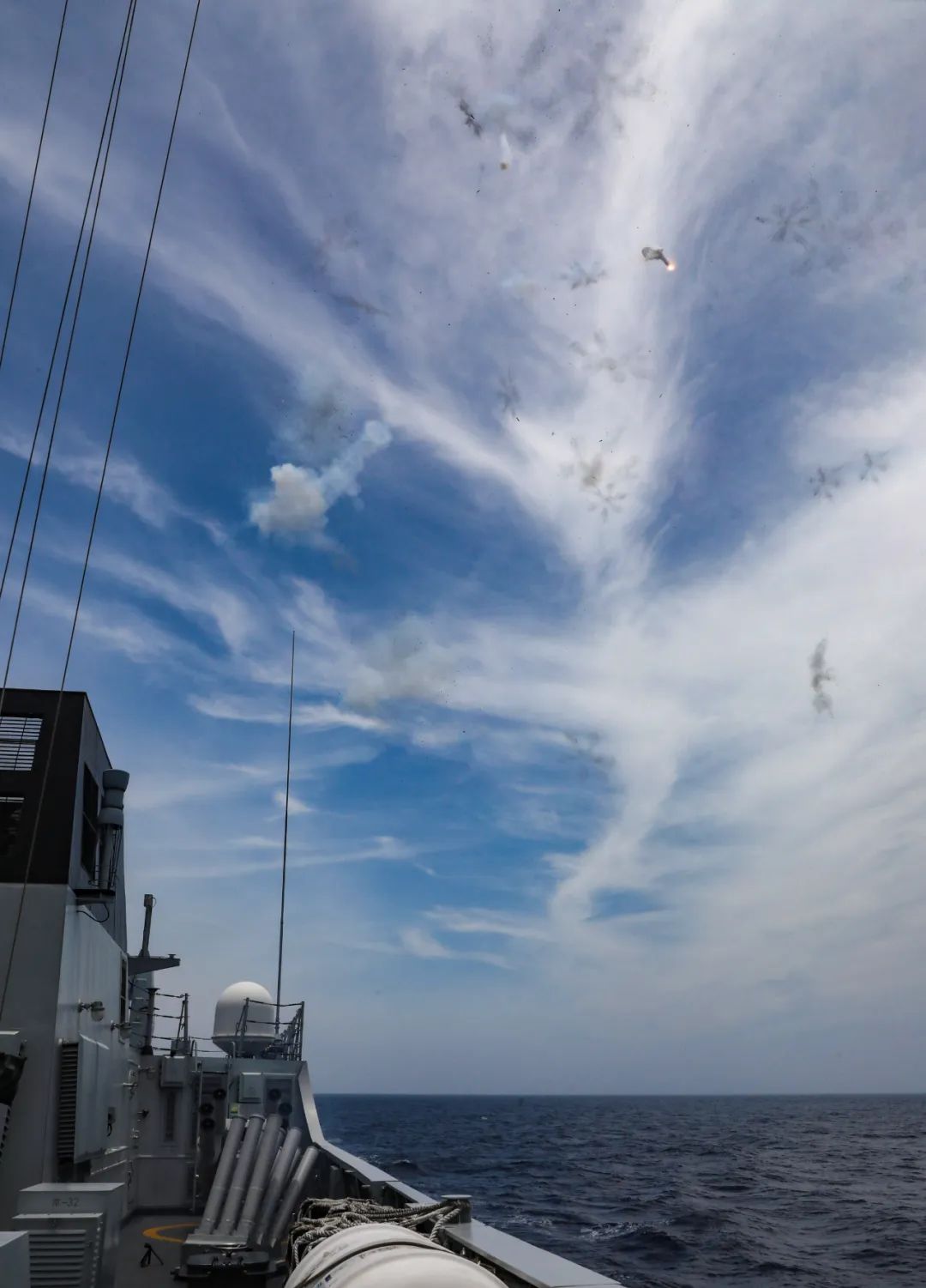 海面激战正酣,空中威胁接踵而来。“方位XX,发现末制导雷达信号。”面对“敌”机来袭导弹,铜陵舰快速发射干扰弹,并借助干扰弹掩护,调整舰艇航向航速进行机动规避。