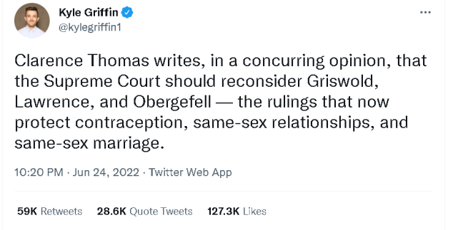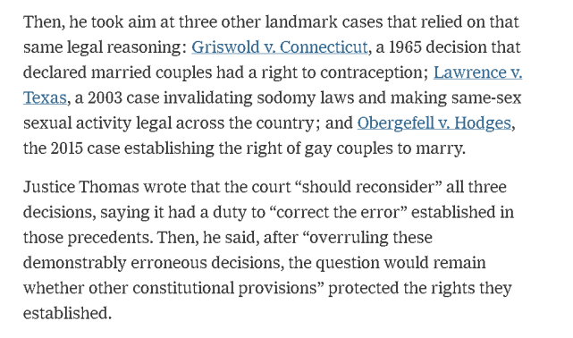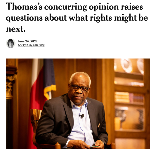 根据美国《纽约时报》和《华盛顿邮报》的报道,尽管美国最高法院在裁决废除宪法对女性堕胎权保护的法律意见中表示,如今的这个裁决只是针对的1973年的堕胎权判例,并不会影响到最高法院先前的其他判例,但支持废除宪法对堕胎权的保护的6名保守派大法官之一的克拉伦斯·托马斯却表示,如今这个裁决的法律逻辑,也可以用来被推翻美国最高法院此前做出的事关美国人另外三项重要权利的裁决。