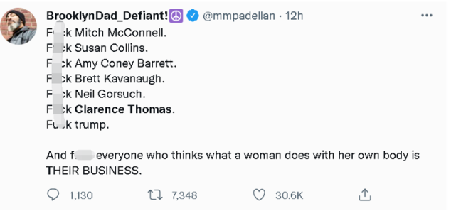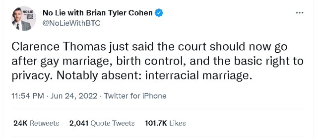 可是,在已经因女性失去宪法保护的堕胎权而爆炸的美国舆论场上,托马斯的这一观点却无异于是火上浇油。在社交网络上,许多美国网民都在斥责托马斯这是想把美国的历史倒车一直开下去,有的人更是激动地只会对他乃至其他保守派大法官骂脏话了。