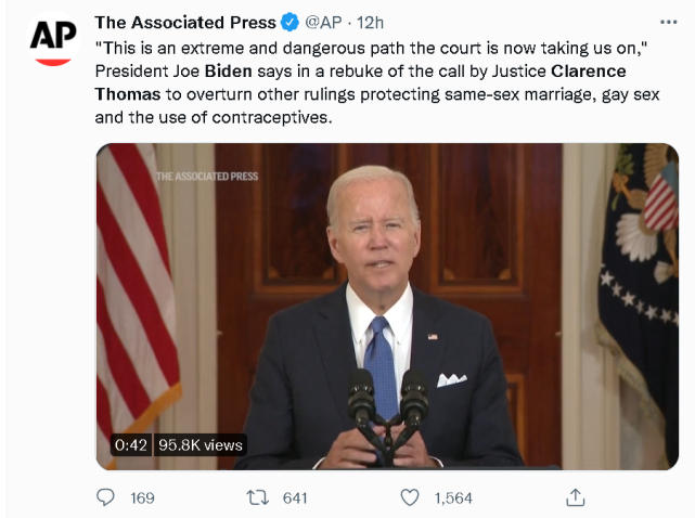 就连美国总统拜登都被他的这个立场吓得紧急表态,称托马斯等保守派大法官主导的美国最高法院正在将美国带向一个极端和危险的道路上。