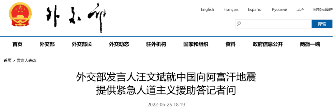外交部官网6月25日发布外交部发言人汪文斌就中国向阿富汗地震提供紧急人道主义援助答记者问。