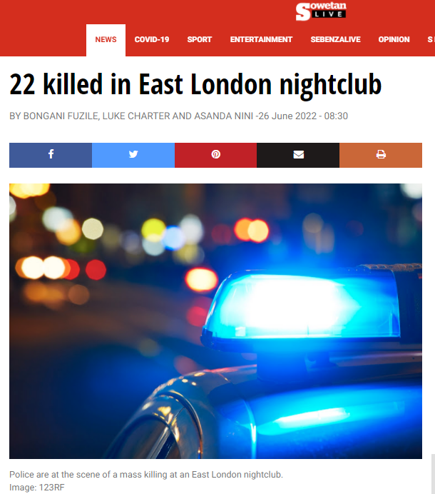 【环球网报道】据南非媒体《索威坦报》26日报道,当地时间6月26日凌晨,南非东开普省港口城市东伦敦市一家夜总会内有22名人员死亡。《索威坦报》将这起事件形容为“可怕的场景”。