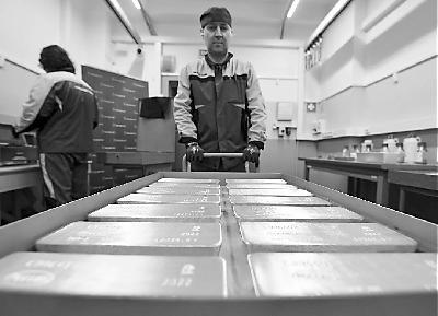 俄罗斯Krastsvetmet有色金属冶炼厂内,工人正在码放刚刚制成的金条。