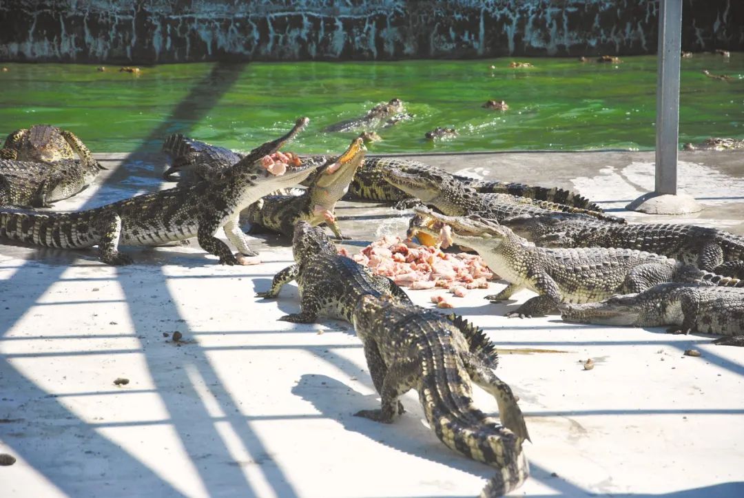 “开饭啦!”上午10时许,饲养员拿着竹竿在地上一阵猛磕,发出“咚咚咚”声响,随即扔出一只只处理好的白条鸡架子,鳄鱼听到熟悉的信号声,纷纷从水中爬上岸,争抢食物。