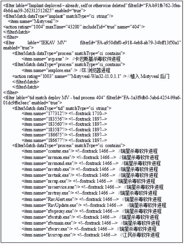 “酸狐狸平台”服务器上的过滤器规则片段,过滤器中重点针对目标环境中的卡巴斯基杀毒软件、瑞星杀毒软件、江民杀毒软件等中国地区流行的杀毒软件。