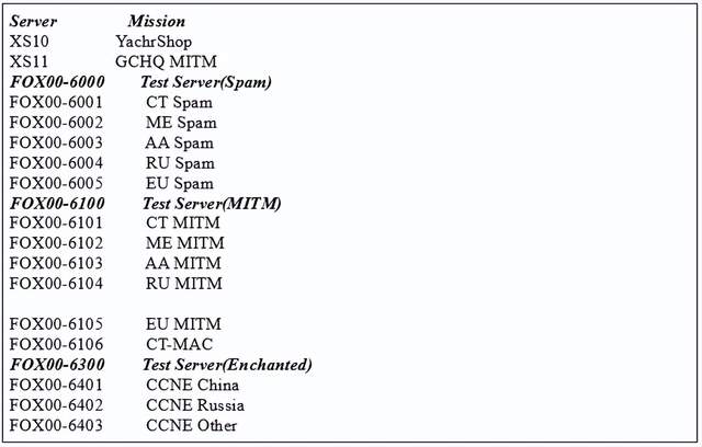 值得注意的是,编号为XS11的服务器被明确分配给英国情报机构“英国政府通信总部”(GCHQ)开展中间人网络攻击行动。此外,TAO针对中国和俄罗斯目标设置了专用的“酸狐狸平台”服务器,编号为FOX00-64的系列服务器被用于支援计算机网络入侵行动队的漏洞攻击行动,其中编号为FOX00-6401的服务器专门针对中国目标,FOX00-6402的服务器专门针对俄罗斯目标。