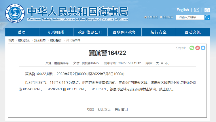 据中国海事局网站消息,唐山海事局发布航行警告,7月2日0时至7月8日10时,渤海部分海域进行实弹射击活动,禁止驶入。