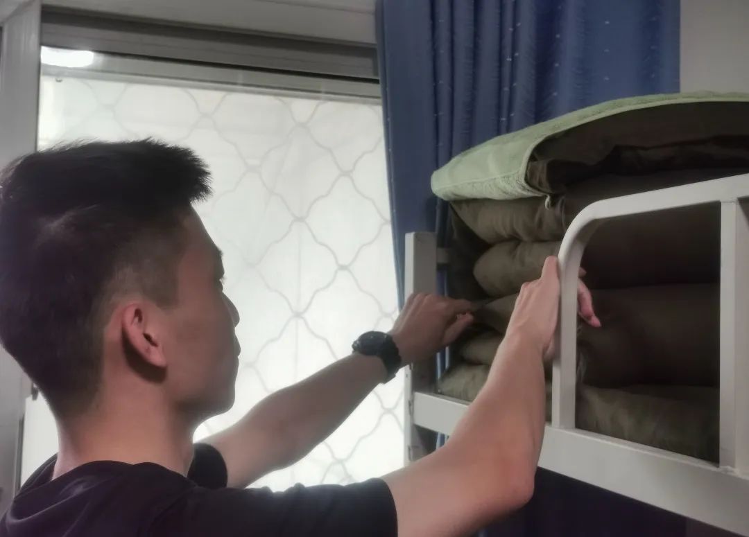 汤志豪正在整理床铺