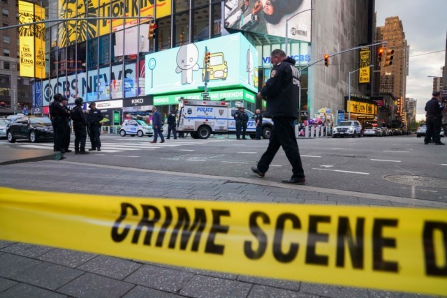 2021年5月8日,警察在美国纽约时报广场的枪击发生地点附近工作。新华社记者王迎摄