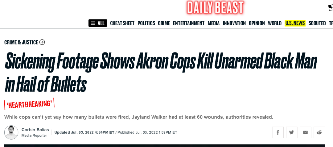 其具体的案情是,在当地时间6月27日凌晨,沃克因交通违章而被俄亥俄阿克伦市的警方要求停车,但他没有服从警方的要求,而是选择驾车逃逸,后又弃车逃跑,最终当他准备回身面对警察时,被追捕他的8名警察乱枪打死。事后警方记录显示当时这8名警察射出了90发子弹,其中60发打在了沃克的身上。