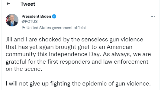 拜登当天在推文中写道:“‘独立日’发生的毫无意义的枪击暴力事件再次给美国社区带来悲痛,吉尔和我对此感到震惊。与往常一样,我们感谢第一时间赶到现场的救援人员和执法人员。我不会放弃与枪支暴力流行病作斗争。”