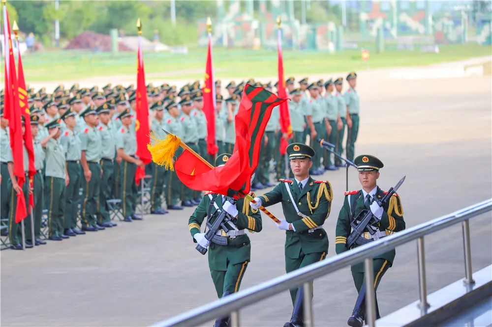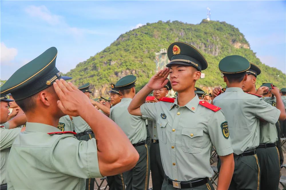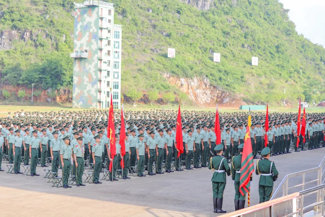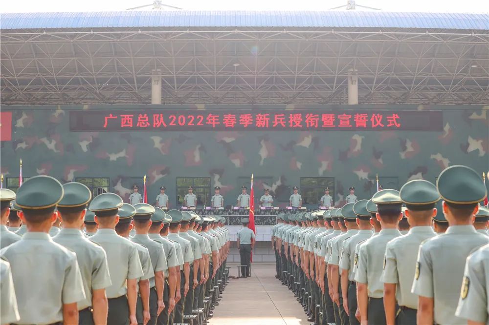 在中国共产党101岁华诞,7月1日上午,武警广西总队新兵团举行新兵授衔暨宣誓仪式!初春三月,他们离开故乡,踏上青春列车从五湖四海齐聚绿色军营,经过三个多月的摸爬滚打,迎来了属于他们的军旅荣誉时刻。新兵们稚嫩的脸庞如今已满是坚毅,伴随着雄壮的军歌声,迎来鲜艳的武警部队军旗,授衔仪式正式开始!