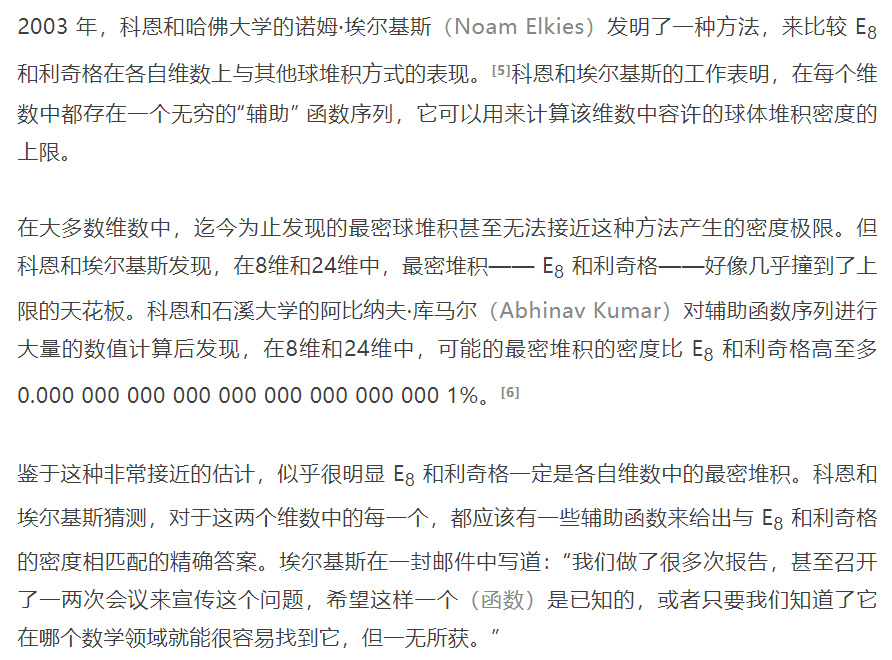 在高维空间中寻找相同大小球体的最密堆积应该比黑尔斯解决的三维情形更复杂,因为每增加一个维度就意味着有更多可能的堆积方式要考虑。然而数学家们早就知道有两个维数是特殊的:8维和24维,这两个维数中分别存在着被称为E8 和利奇格(Leech lattice)的对称球堆积, 这两种令人眼花缭乱的球堆积要好于在其他维数上已知的最密球堆积的候选者。