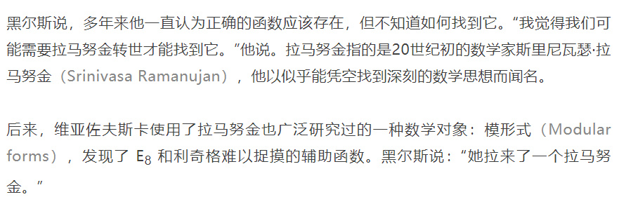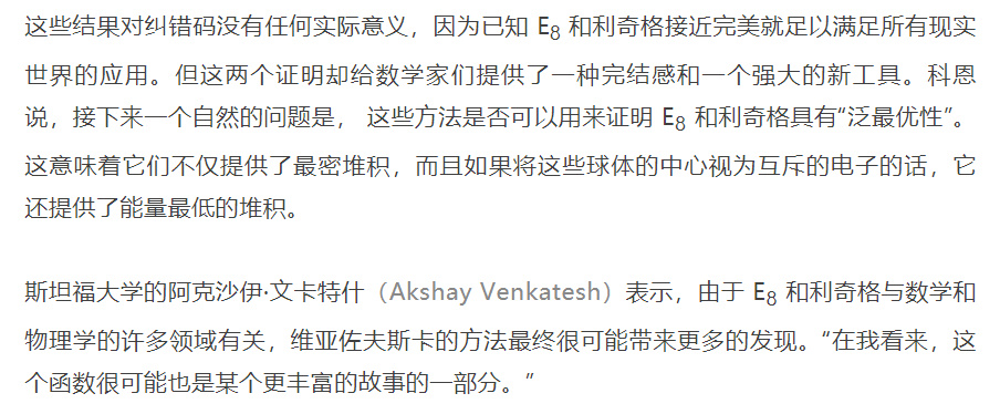 “不知怎么的,一切都刚好完美地融合在了一起,这简直是个奇迹。”马萨诸塞州剑桥市微软新英格兰研究院的数学家亨利·科恩(Henry Cohn)说,“我想不出一个简单且直观的方法来解释它是什么。”