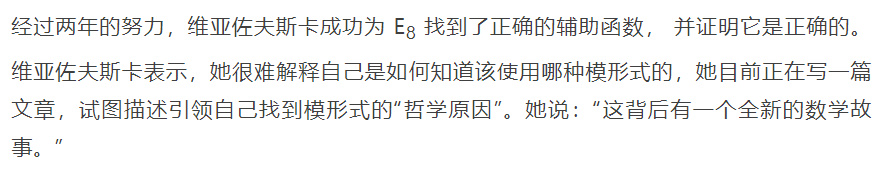 2016年3月14日,马林娜·维亚佐夫斯卡(Maryna Viazovska)在线发布了一篇论文,给出了8维情形缺少的函数。[2]她的工作使用了模形式的理论,模形式是一种强大的数学函数,当它被应用于某个问题时, 似乎可以解锁大量的信息。在8维情形下,当时还是柏林数学学院和柏林洪堡大学博士后研究员的维亚佐夫斯卡找到正确的模形式,只用23页纸就证明了 E8 是最密的8维堆积。
