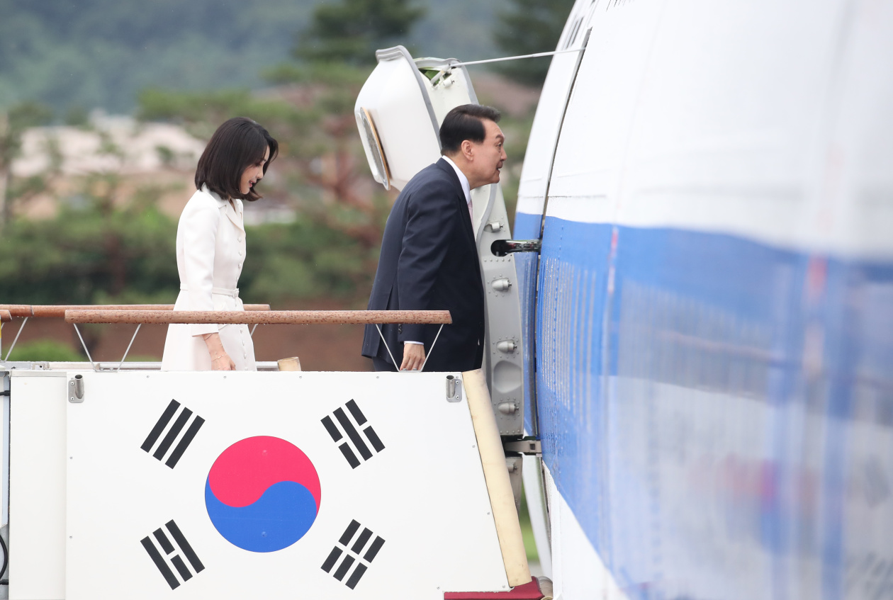 6月27日尹锡悦与夫人金建希登机,飞往西班牙首都马德里。图源:IC photo