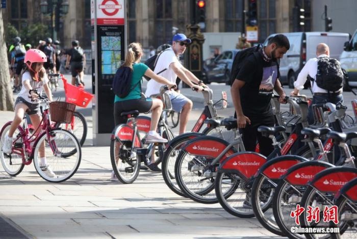 2020年7月29日,在英国首相鲍里斯·约翰逊于本周向民众宣布免费发放“50镑自行车维修代金券”计划后,伦敦大街小巷兴起“自行车骑行热”。图为街边四处停放的自行车,成为人们出行的主要交通工具。 中新社记者 张平 摄
