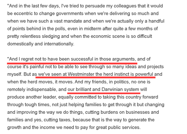 接下来,他开始隐晦地表达了自己“壮志未酬”的心情,甚至还流露出了一丝对英国议会不满的情绪。他说自己在过去几天里一直在告诉党内同僚,在落实政府的重要政策以及在面对国内外经济形势越发艰难的重要时刻,更换政府是轻率的,而且民调上保守党落后的也不多。但让他“遗憾”的是,他未能成功地用说服自己的同僚,所以在议会“群体本能”的驱使下,他才不得不离开。他还说他会继续支持任何接替他工作的继任者,相信英国“明智”和“达尔文主义”的体制能够带来一位“同样能致力于带领国家走出困境”的领袖。