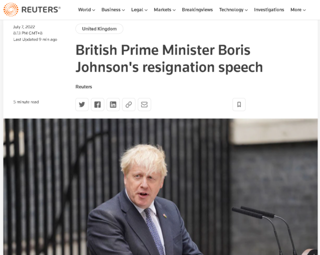 据英国路透社报道,英国首相鲍里斯·约翰逊已于当地时间周四正式宣布辞去英国保守党领袖和英国首相的职位,但会在继任者被选出之前继续留任。他还在英国伦敦唐宁街10号的首相官邸前发表了一番辞职演讲。