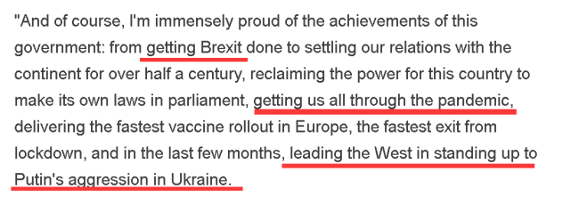 其次,约翰逊开始历数了一番自己的政绩,包括“完成脱欧”;“夺回了在英国的议会里制定英国自己法律的权力”;带领英国人“挺过新冠疫情”而且是全欧洲接种疫苗的速度和走出封锁的速度都“最快”的国家;以及“领导西方对抗普京对乌克兰的攻势”。他在提到乌克兰时还特别表示希望告诉乌克兰人英国会“继续支持”乌克兰“为自由而战”。