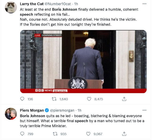 就连英国首相府那只知名的“首席捕鼠大臣”猫咪“拉里”的账号,都发帖对约翰逊进行了一番猛烈的吐槽,称约翰逊并没有在临走前给公众留下一个谦逊的形象,而是仍然活在自己的妄想中,认为自己是受害者。
