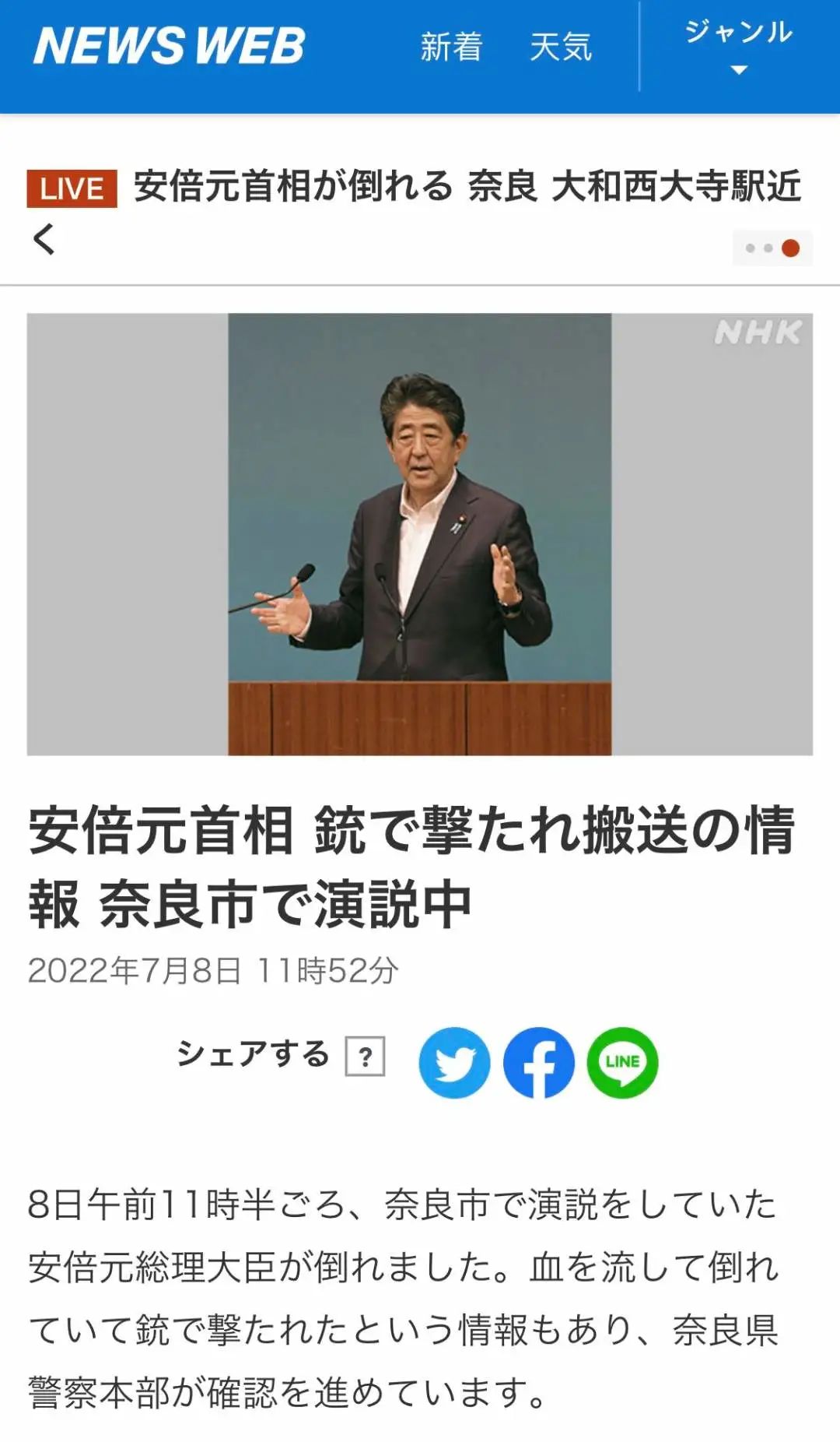 据日本广播协会电视台NHK报道,当地时间8日11时30分许,正在日本奈良市进行街头演说的日本前首相安倍晋三遭枪击倒地。
