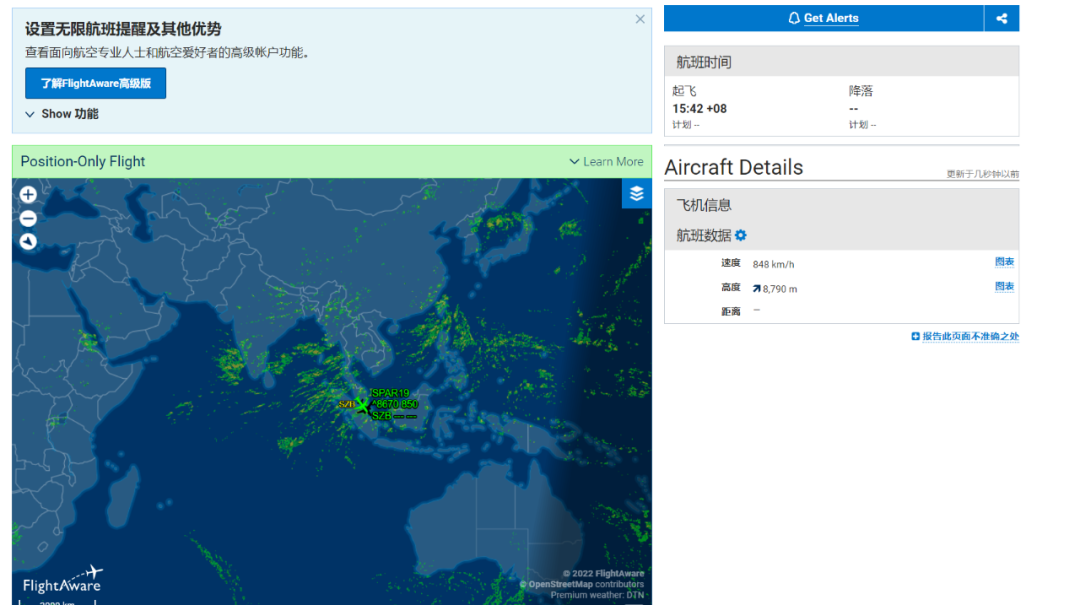 航班跟踪与数据平台FlightAware公布的信息显示,美国众议院议长佩洛西率领的代表团曾乘坐的美国C-40政府包机(呼号SPAR19)已经于当地时间15时50分从吉隆坡雪邦国际机场起飞,飞行目的地并未公布。佩洛西一行人是否在这架飞机上,外界尚不清楚。