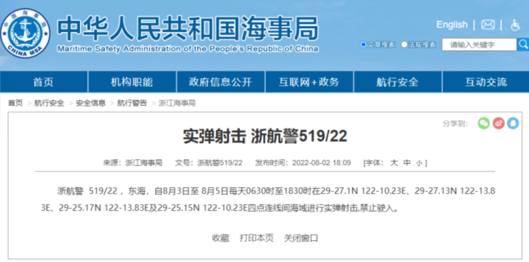 浙航警 519/22,东海,自8月3日至8月5日每天0630时至1830时在29-27.1N 122-10.23E、29-27.13N 122-13.83E、29-25.17N 122-13.83E及29-25.15N 122-10.23E四点连线间海域进行实弹射击,禁止驶入。
